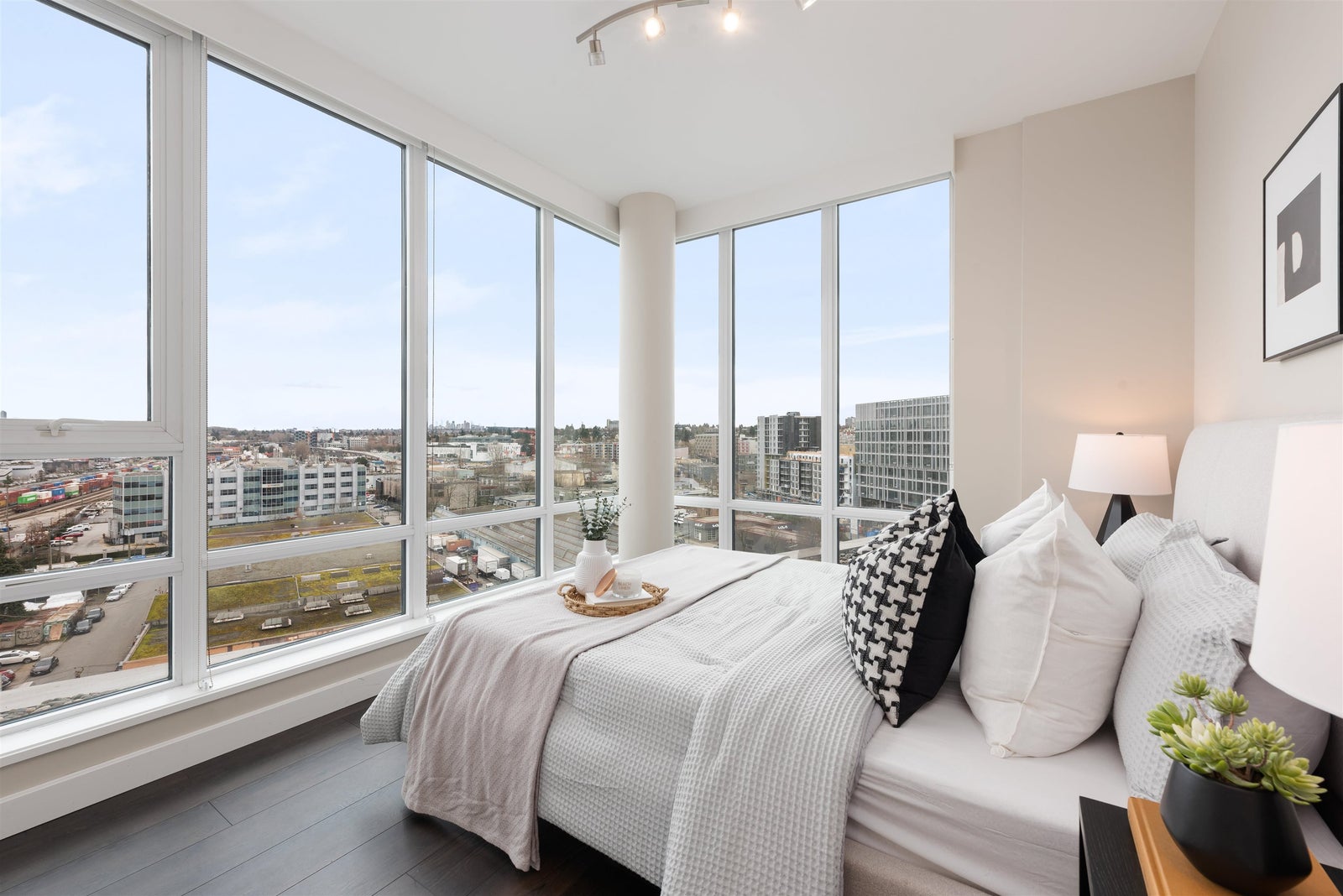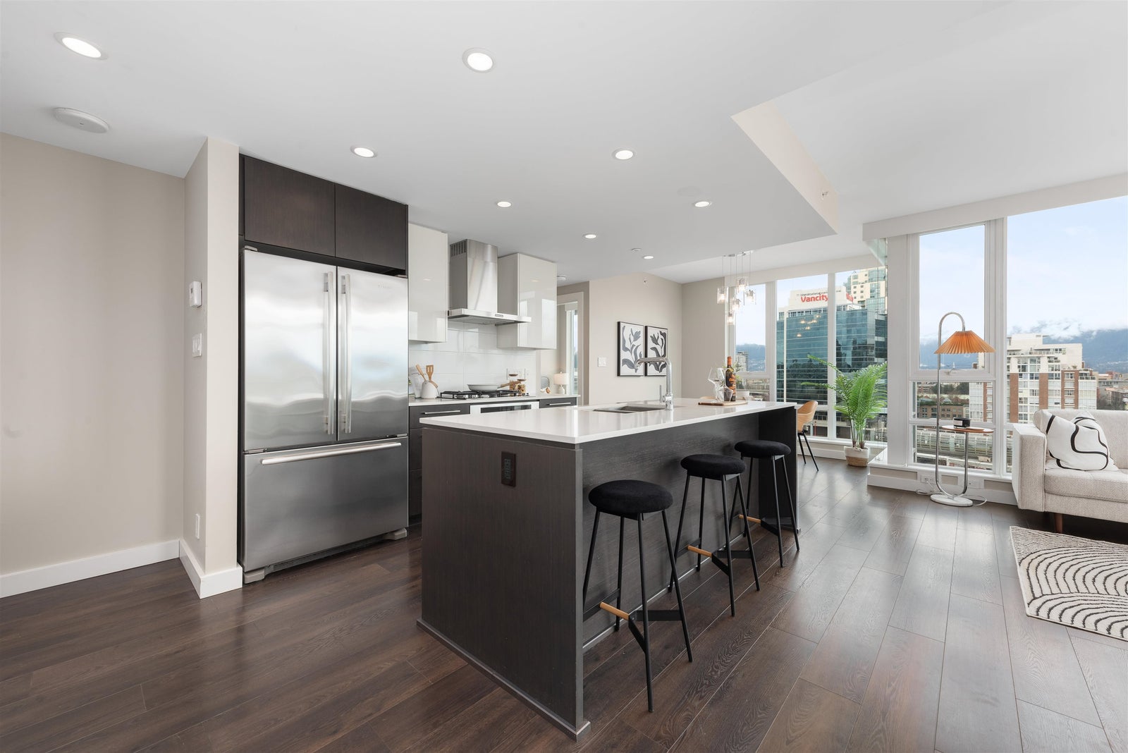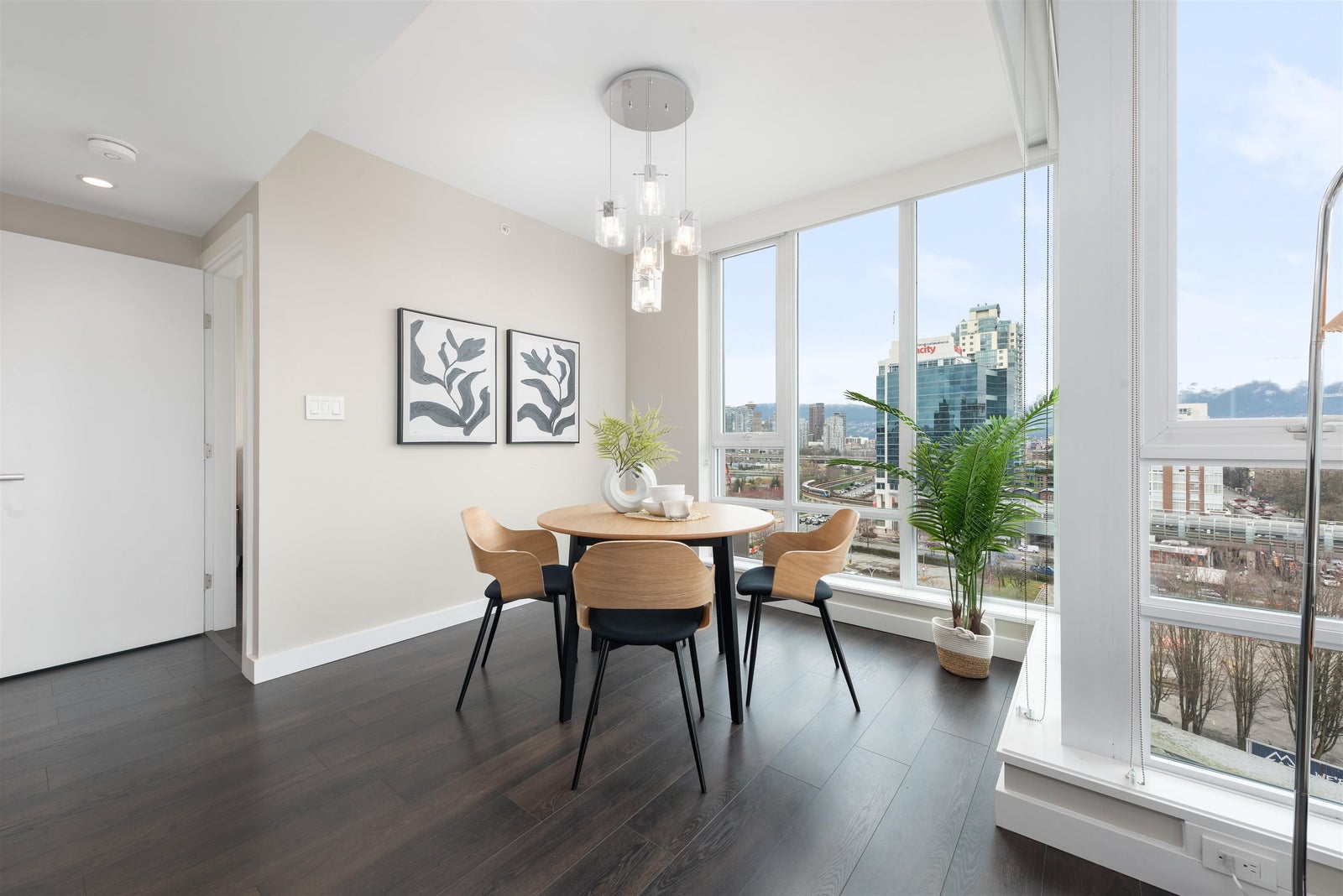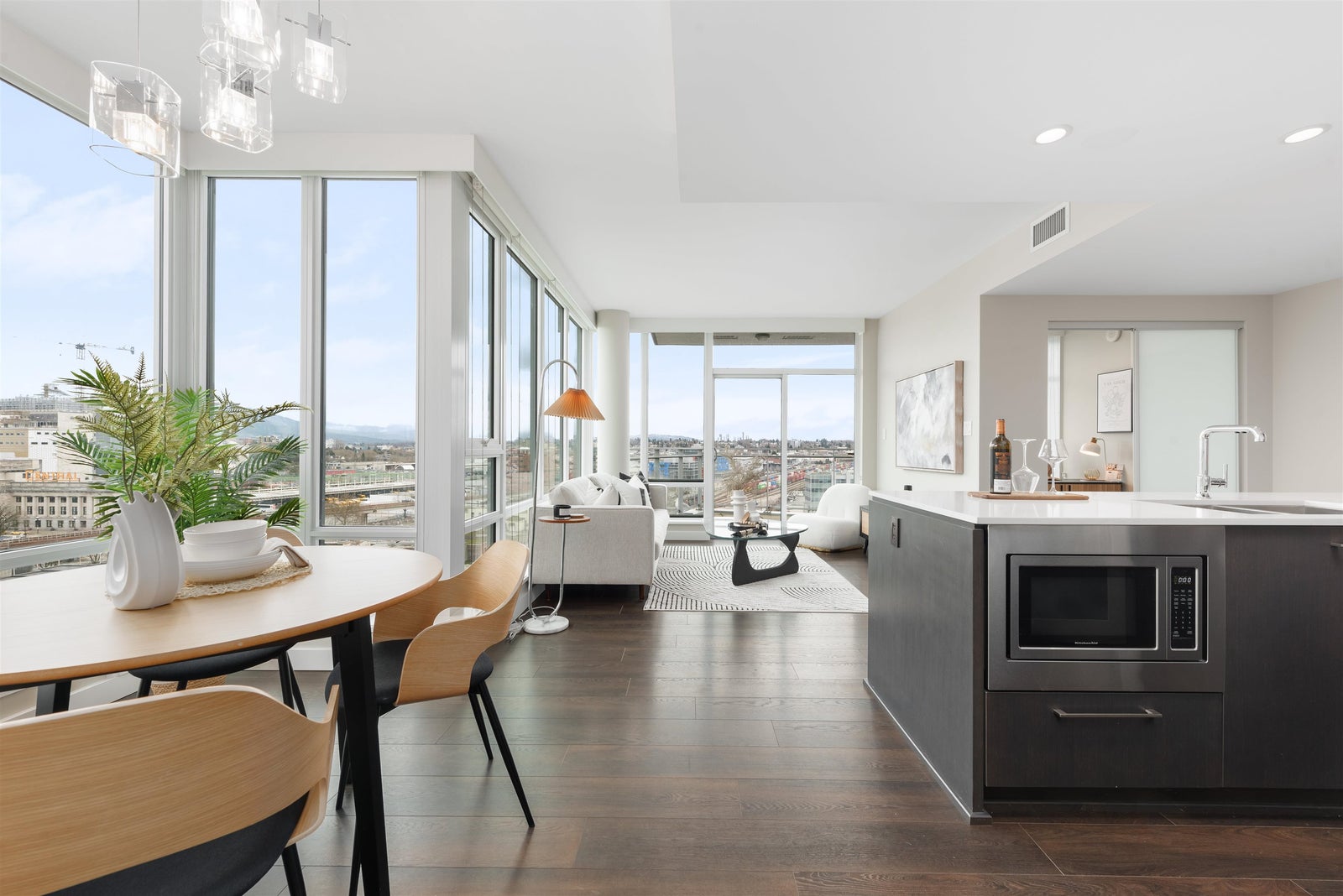 Welcome to Central by Onni! This rare corner unit features 2 beds, 2 baths, a flex room, a den, and balcony offering versatility and space. This bright northeast-facing home showcases stunning city and mountain views and includes central AC and heating for year-round comfort. The modern kitchen boasts integrated stainless-steel appliances and sleek quartz counters. Enjoy luxury amenities like a full-time concierge, rooftop dining terrace with a garden, full-size gym, party room, and theatre. Steps to the seawall, Skytrain, and Olympic Village. Includes 2 side-by-side parking spots and a storage locker. Don’t miss this exceptional opportunity to own in one of Vancouver’s most sought-after neighbourhoods!