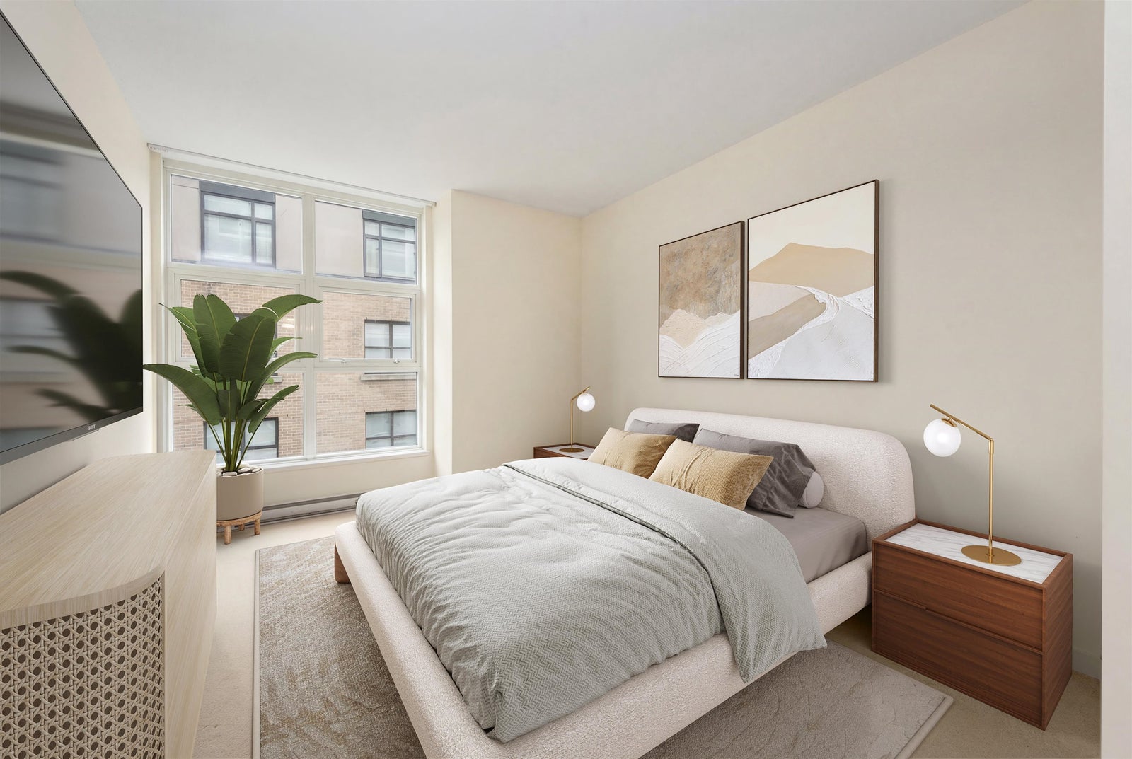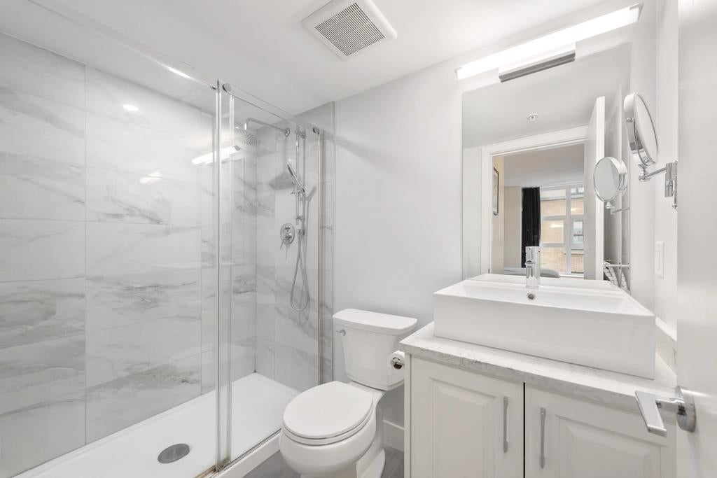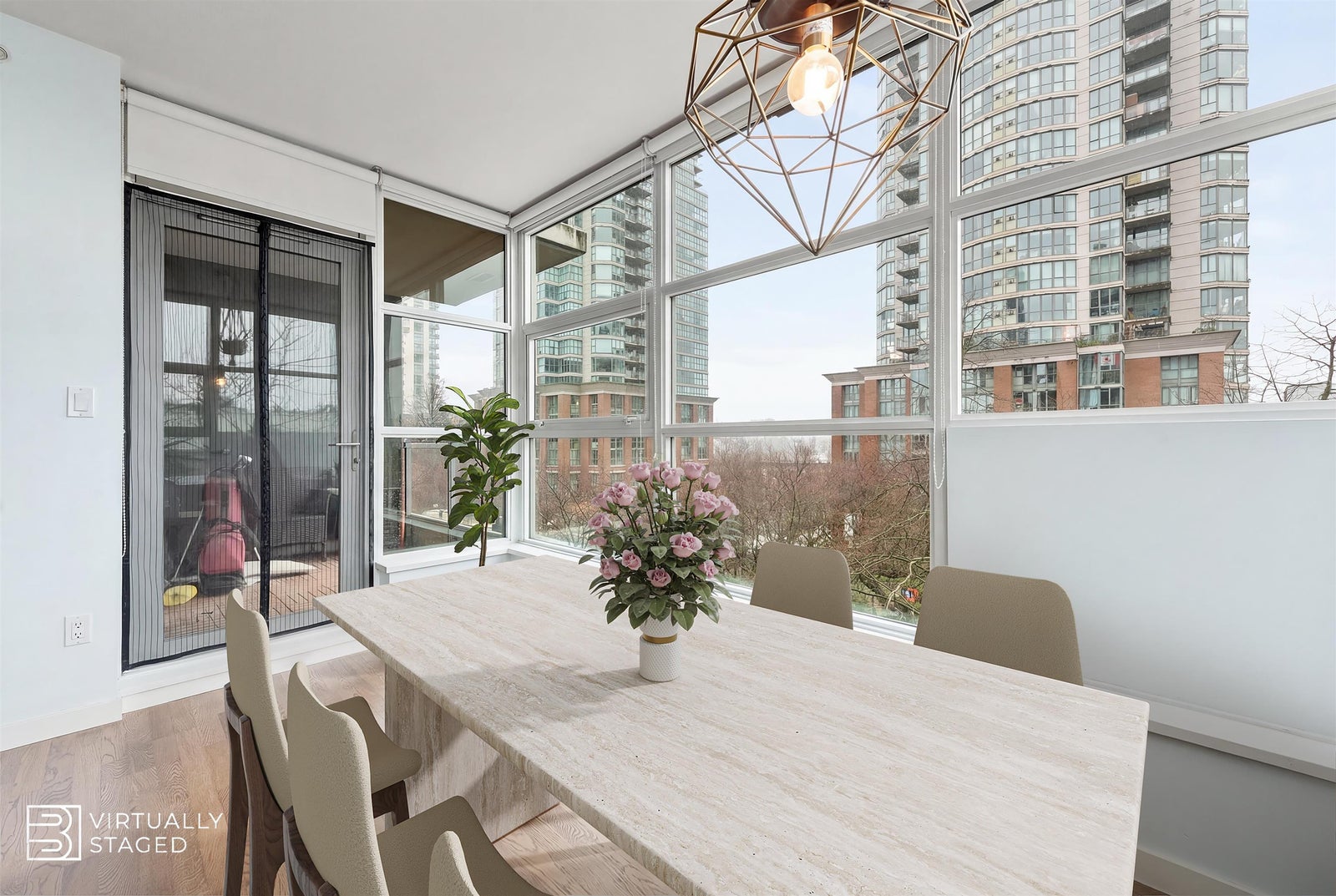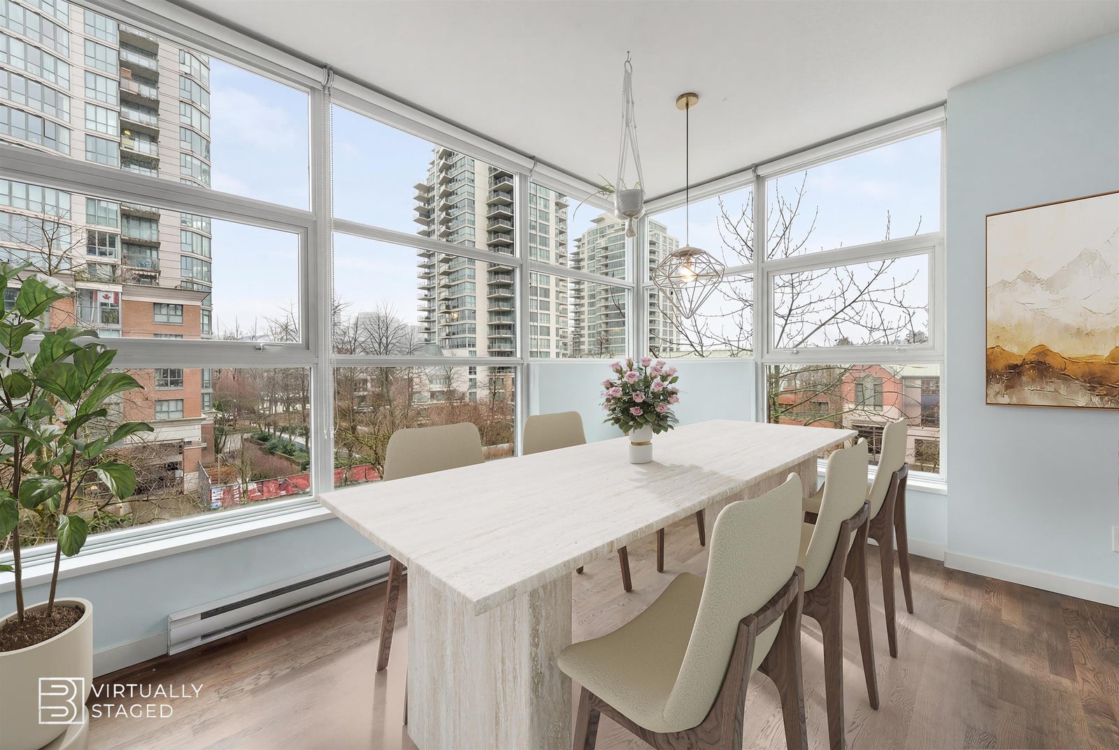 Sussex by Bosa. Bright and spacious 2-bed, 2-full-bath corner home offering 1,018 sq.ft. with a highly functional layout. Northwest exposure and quietly positioned facing the inner courtyard, this home enjoys a peaceful outlook while still being in the heart of the city. Recently renovated bathrooms add a fresh, modern touch, complementing the generous living and dining areas perfect for everyday living and entertaining. Unbeatable location: just 1 block from the SkyTrain and minutes to the Seawall, Olympic Village, Downtown, historic Chinatown and the new upcoming St. Paul's Hospital. A rare opportunity to own a well-located home that offers space, comfort, and everyday convenience right at your doorstep. 1 parking stall (EV Ready) & 1 storage locker.
