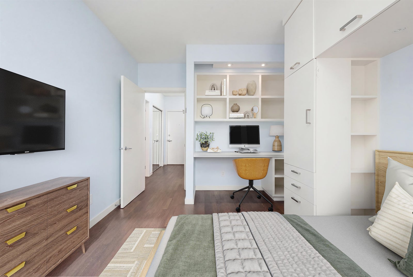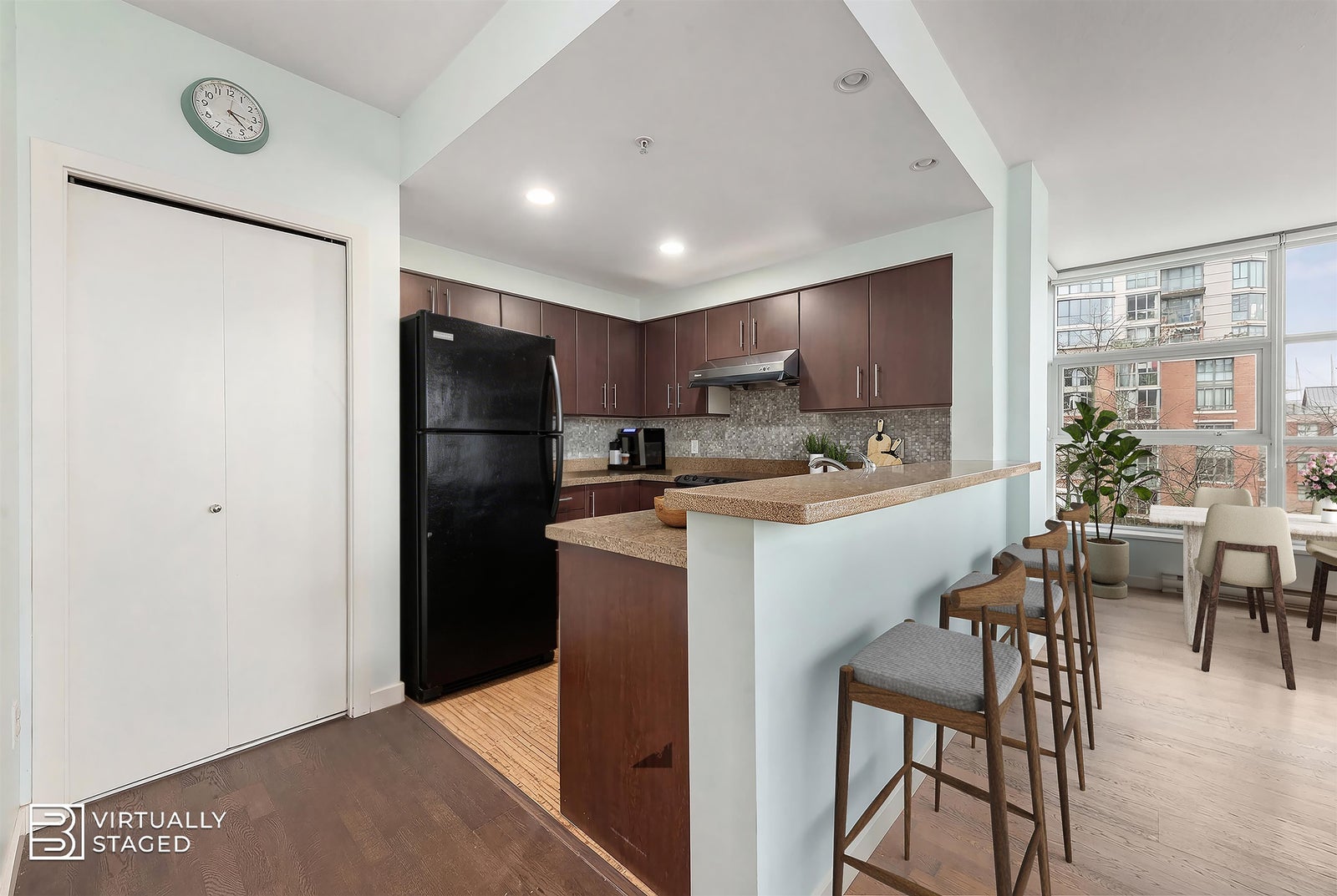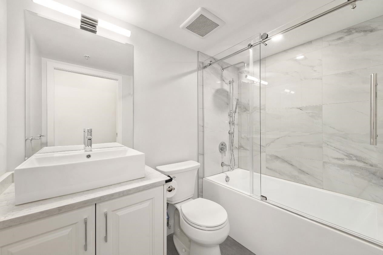 Sussex by Bosa. Bright and spacious 2-bed, 2-full-bath corner home offering 1,018 sq.ft. with a highly functional layout. Northwest exposure and quietly positioned facing the inner courtyard, this home enjoys a peaceful outlook while still being in the heart of the city. Recently renovated bathrooms add a fresh, modern touch, complementing the generous living and dining areas perfect for everyday living and entertaining. Unbeatable location: just 1 block from the SkyTrain and minutes to the Seawall, Olympic Village, Downtown, historic Chinatown and the new upcoming St. Paul's Hospital. A rare opportunity to own a well-located home that offers space, comfort, and everyday convenience right at your doorstep. 1 parking stall (EV Ready) & 1 storage locker.